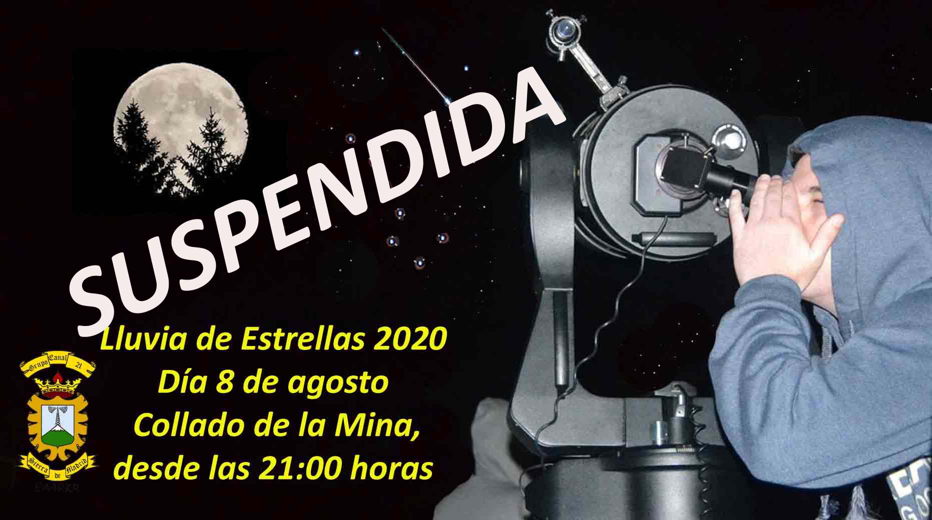 Estimados compañeros/as de Banda Ciudadana. Lamentamos comunicaros que la actividad que teníamos programada para el próximo día 8 de agosto denominada Lluvia de Estrellas, nos vemos nuevamente a suspenderla al igual que todas las anteriores del año que llevamos en curso. Esta suspensión viene motivada por la misma razón que las demós, la situación sanitaria a consecuencia de la pandemia del COVID19.